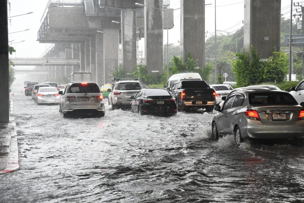 泰南不少地区已变成泽国,街道积水深及车辆车窗,许多车辆几乎被洪水吞没。