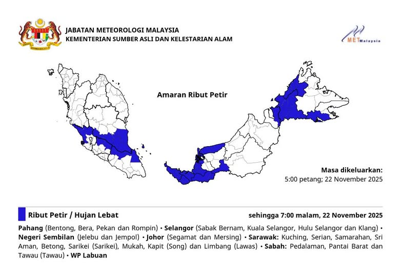 马来西亚气象局(MetMalaysia)于今日下午5时发布雷暴警报(AMARAN RIBUT PETIR),预测我国多个州属和地区将出现雷暴、大雨及强风,警报有效期至今晚7时正(2025年11月22日,星期六)