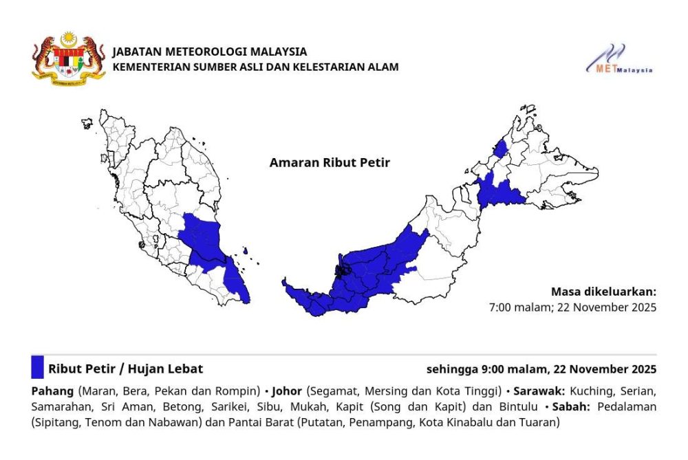 根据马来西亚气象局最新发布的暴风雨警报,预计今晚至9点,马来西亚多个地区将遭遇强雷暴、暴雨和强风。以下是受影响的州和地区: