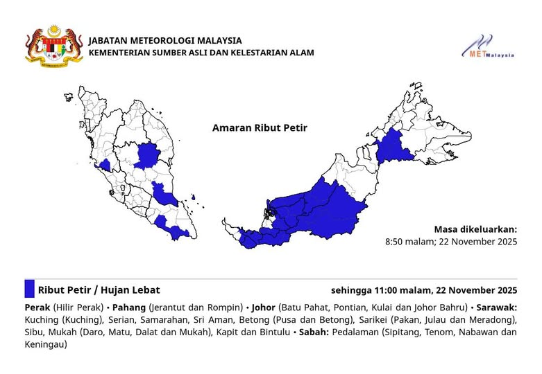 多个州属发布雷暴、豪雨与强风预警,预计从傍晚持续至 2025 年 11 月 22 日(星期六)晚间 11 时。受影响的地区包括: