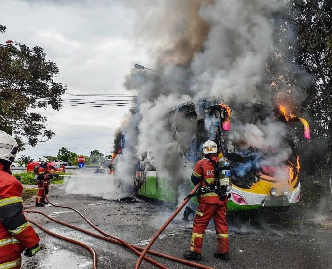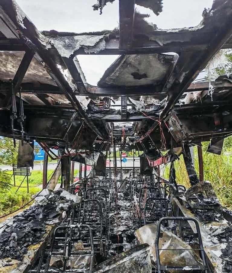 砂拉越三马丹发生一起惊险火烧车事故,一辆行驶中的巴士突然冒出火光,短短数分钟内火势迅速扩散,整辆车被烧毁约八成,车内座椅更全被烧成焦黑废铁,所幸无人受伤。