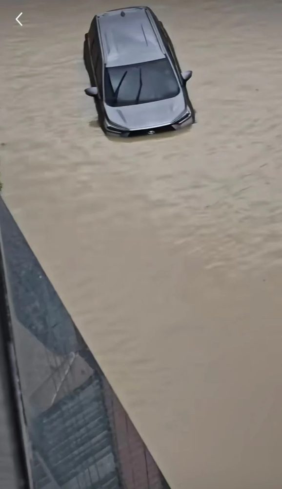 从小红书用户“Vincy”上传的视频可见,酒店外已成一片汪洋,路旁多辆轿车几乎完全泡在浑浊的积水中。