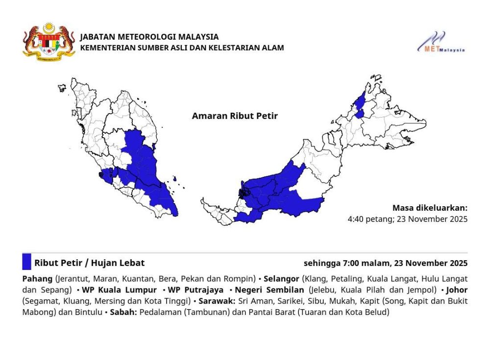 马来西亚气象局(MetMalaysia)于今日下午4时40分发布最新的雷暴警报(AMARAN RIBUT PETIR),预测半岛和东马多个州属和直辖区将出现雷暴、大雨及强风。警报有效期至今晚7时正(2025年11月23日,星期日)