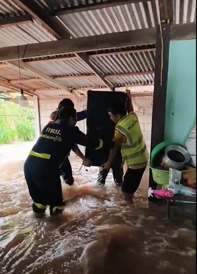 泰南一间双层住家近日在暴雨引发的洪水中严重受损,社交媒体流传的视频显示,水位高达膝盖,洪水在屋内迅速涌动。一名女性站在屋内墙边,表情焦急,小心翼翼地观察着他人帮助将家具移至较高处,以免被水淹没。