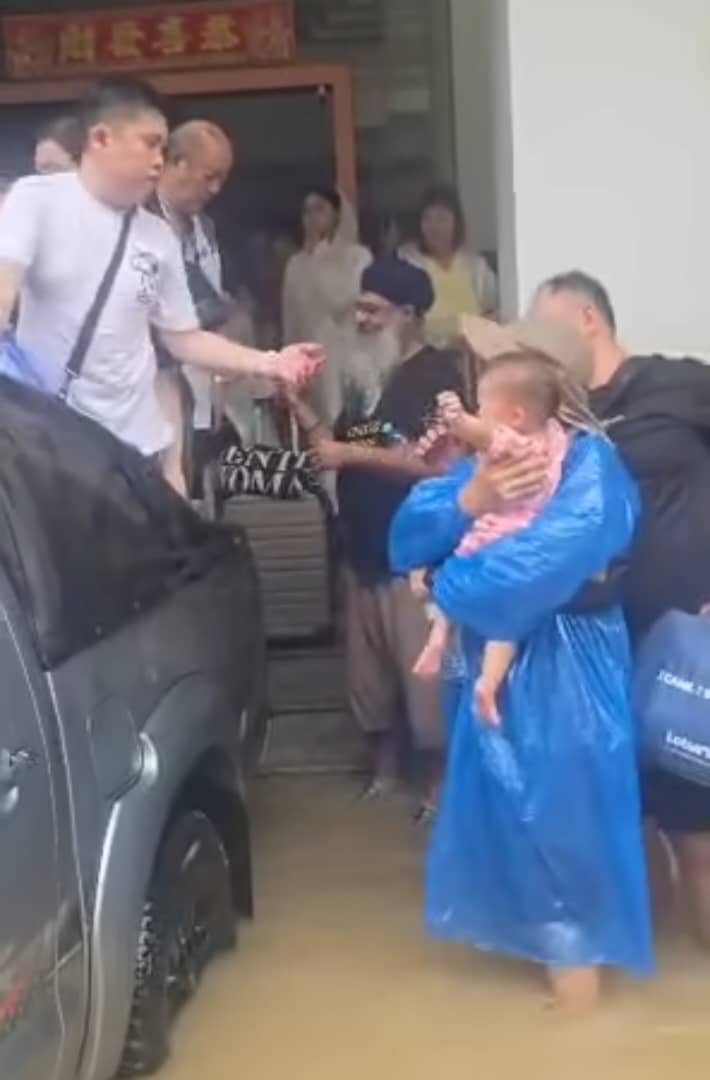 马来西亚锡克联合组织(UNITED SIKHS Malaysia)在其官方面子书发布的视频显示,许多灾民因洪水暴涨被困在高处建筑内,无法自行脱身。救援队抵达后,第一时间将孩童及其监护人安置在四轮驱动车的前座,以确保他们的安全。