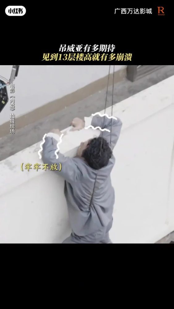 影片中,吴镇宇刚被拉出窗外,整个人的气势瞬间消失。尽管身上绑了安全绳,但13楼的高度实在逼人,他的脸色马上变得惨白,下意识紧抓栏杆不放,双脚疯狂抵住墙面,拼命寻找安全感。