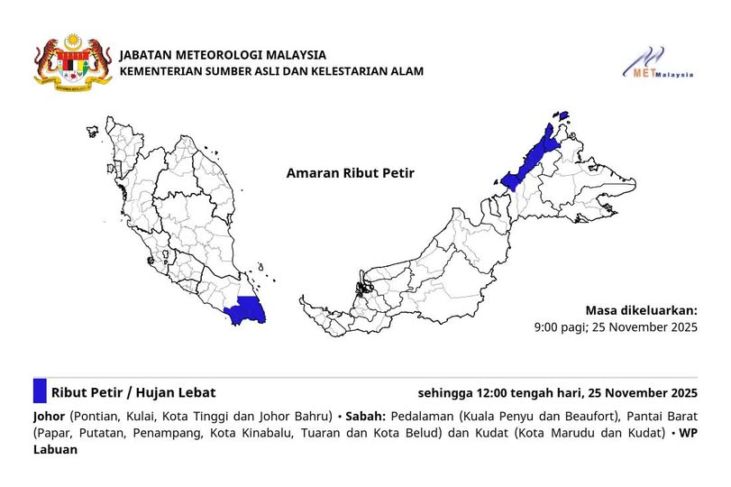 柔佛(笨珍、古来、哥打丁宜、新山)以及沙巴内陆区(瓜拉本尤、保佛)、西海岸区(吧巴、布达丹、兵南邦、亚庇、斗亚兰、古打毛律)和古达区(哥打玛鲁都、古达),连同纳闽联邦直辖区,预计将在2025年11月25日(星期二)中午12时前,出现雷暴、豪雨及强风天气。