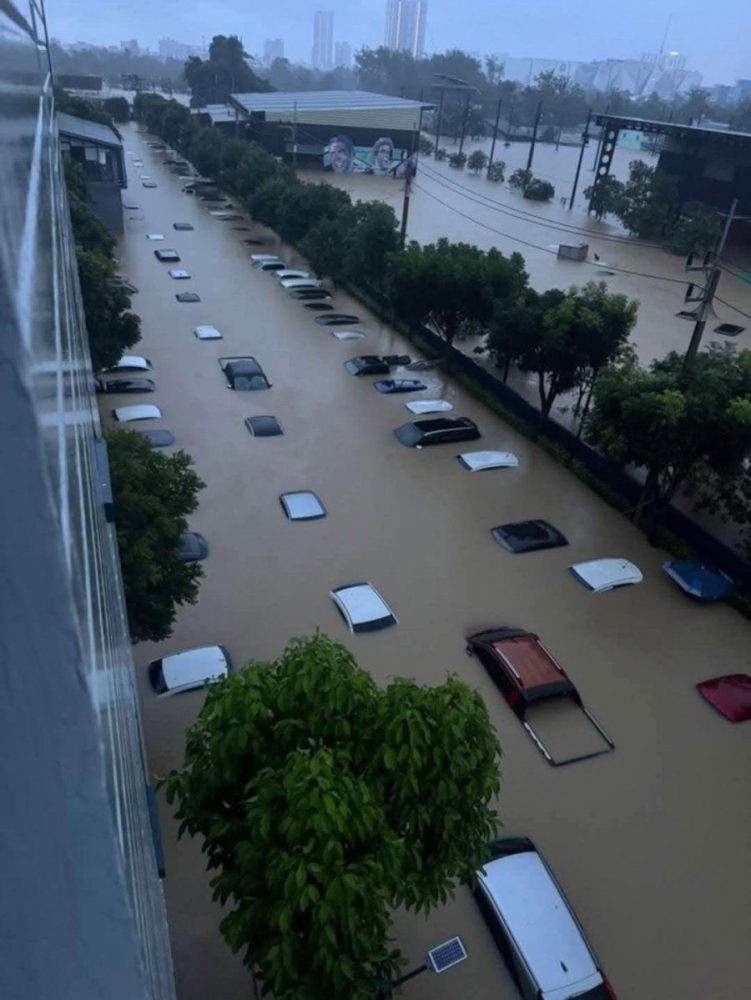 社交媒体上疯传的一段 39 秒视频显示,一名男子今早 6 时 30 分从高处拍摄灾情画面,只见道路成河,停在路边的车辆几乎全被淹没,水势仍不断上涨,逼近建筑物二楼。