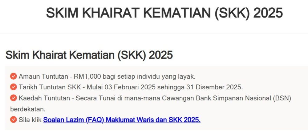 根据内陆税收局(LHDN)发布的最新消息,若 STR援助金受惠者在2025年内不幸离世,其家属可向政府申领 RM1,000死亡抚恤金(Skim Khairat Kematian,SKK)