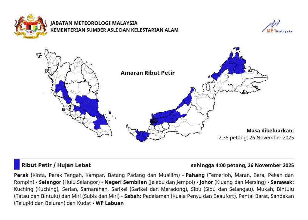 马来西亚气象局(MetMalaysia)于今日下午2时35分发布最新的“雷暴警报”(AMARAN RIBUT PETIR),预测半岛中南部及东马砂拉越和沙巴多州将出现雷暴、大雨及强风。警报有效期将持续至今日下午4时正