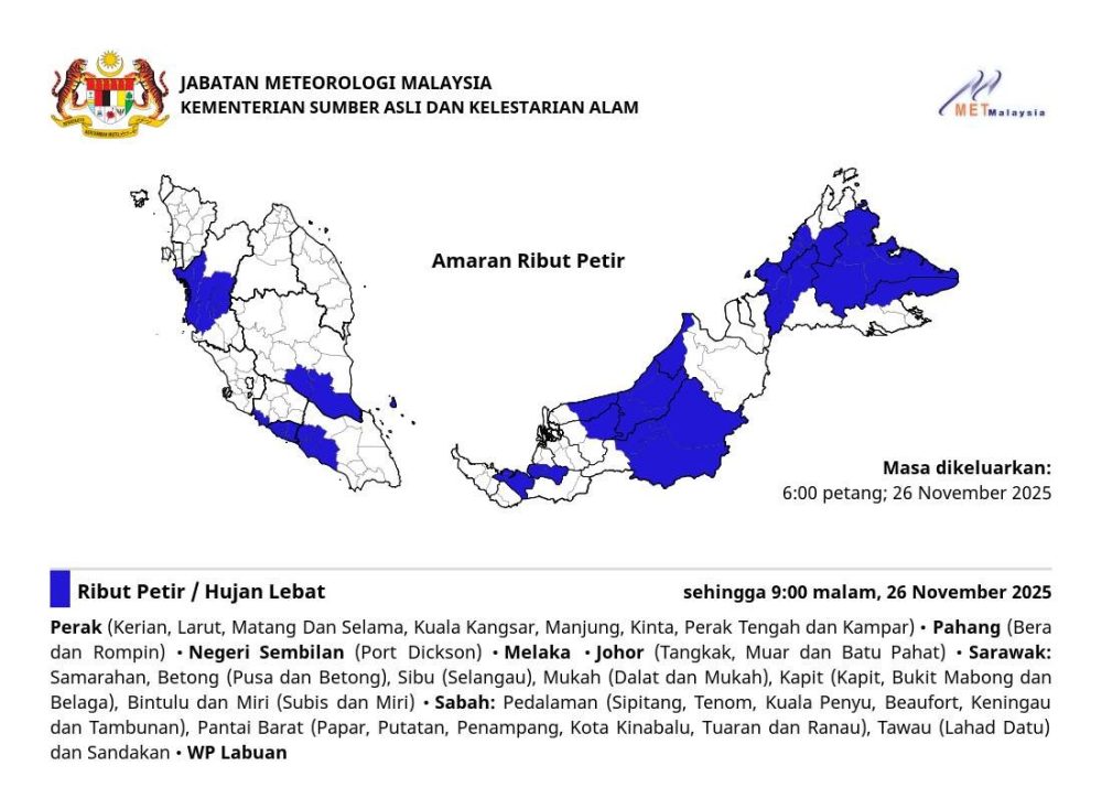 马来西亚气象局(MetMalaysia)于今日傍晚6时发布最新的“雷暴警报”(AMARAN RIBUT PETIR),预测我国半岛中部、南部及东马砂拉越和沙巴多州将出现雷暴、大雨及强风。警报有效期将持续至今日晚间9时正。