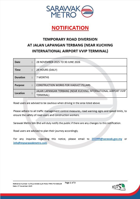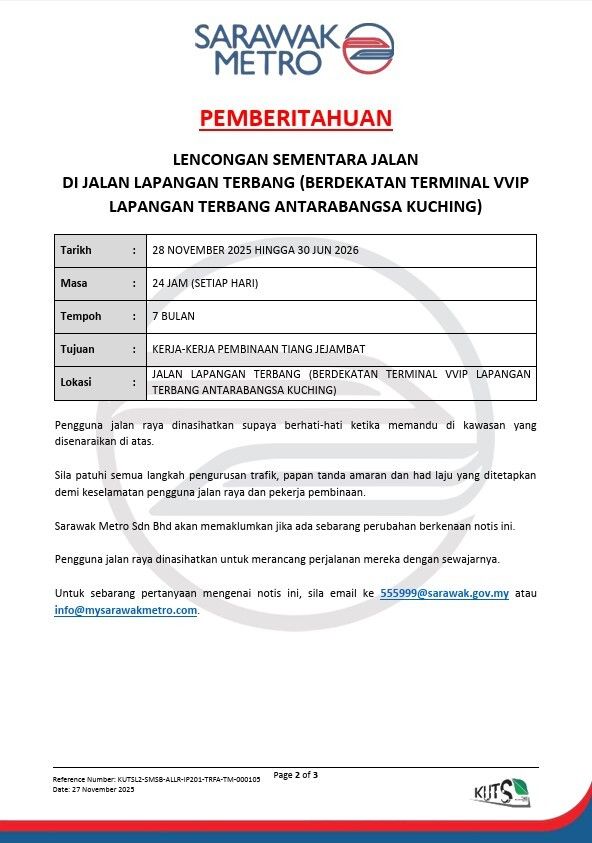 古晋国际机场 VVIP 航站附近的 Jalan Lapangan Terbang 部分路段将进行临时改道,为期 7个月,以配合高架桥桥柱施工工程。