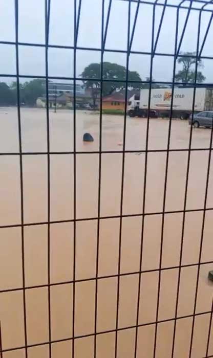 现场可见水面几乎没过脚踝,摊位区已无法行走,幸好部分车辆停在较高处,暂未传出受损消息。