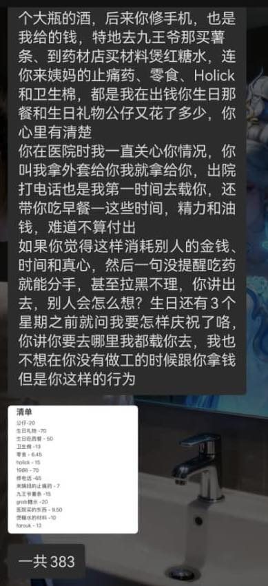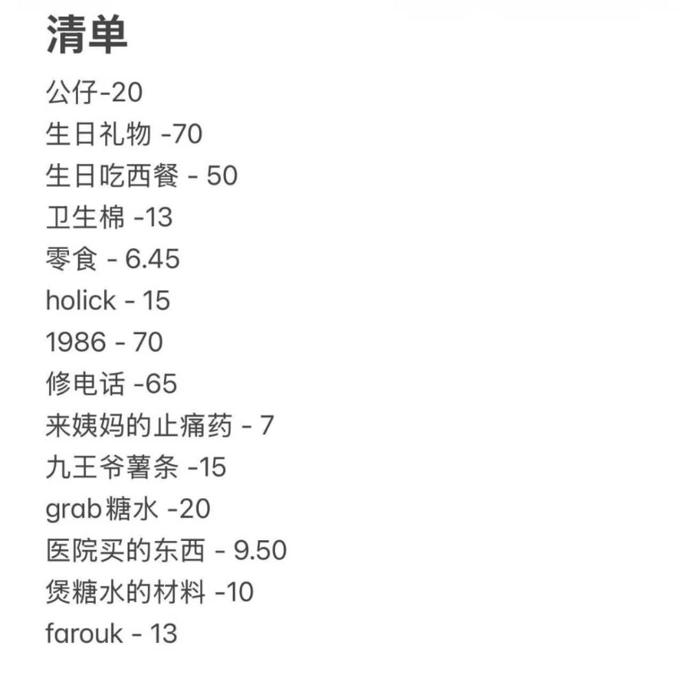 然而分手后,男方却突递上一份详尽的费用清单,让她必须“逐项偿还”。清单内容不仅包括生日礼物、西餐消费、零食与卫生棉等日常用品,甚至连早餐载送的汽油费与姨妈止痛药都一一列明,总数清楚得如商业账本。