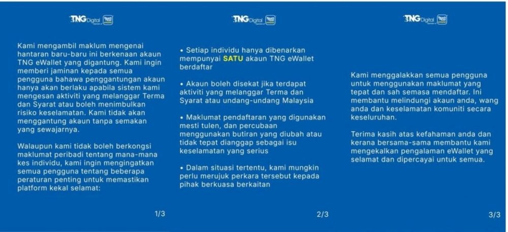 针对事件,TNG今日发声明强调不会在没有适当审核下冻结账户,并指只有侦测到可能违反条款、构成风险或涉及虚假资料时,系统才会采取限制措施。公司也重申每位用户仅允许拥有一个账户,若数据不实、怀疑违规或触犯大马法律,账户可被冻结,甚至在必要时上报执法单位。TNG提醒用户注册时须提供真实资料,以保护自身资金与平台社区安全,并承诺持续提供安全可信赖的电子钱包体验。