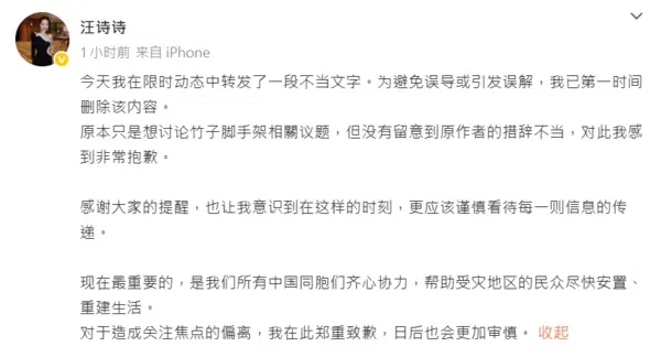 汪诗诗最后强调,目前最重要的是全社会齐心协助灾区民众尽快安置与重建,“若言论造成争点偏移,我郑重道歉,未来将更加审慎表达。”