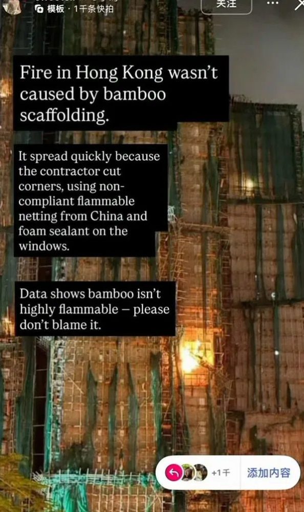 汪诗诗早前在社交平台发文,强调“火灾并非因竹棚架导致”,而是疑因承包商使用不合规、易燃的防护网,加上以泡沫密封窗户,使火势迅速失控。她引用资料称竹材本身并不易燃,并呼吁勿将责任简单归咎于脚手架结构。