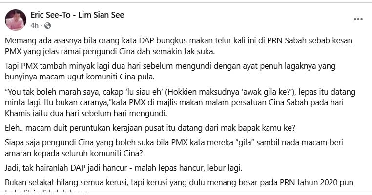 他在面子书发文提到,投票前数日,安华在华社宴会上讲话口气颇强硬,并附带情绪,让不少选民感到被冒犯。他甚至引用安华的原话——