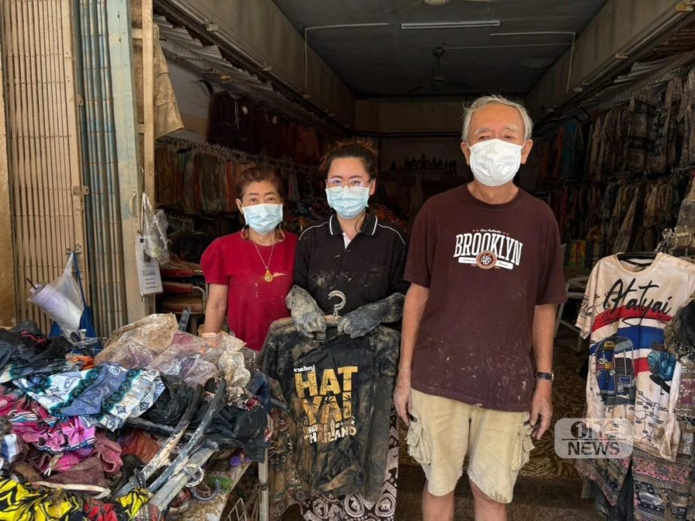 店里的商品几乎全部损毁,浸泡在洪水和泥淖中的衣物无法挽救。为了勉强维持生计,他只能以每件100泰铢(约13令吉),或三件100泰铢的价格出售这些损坏的商品,供那些愿意接受的顾客购买。