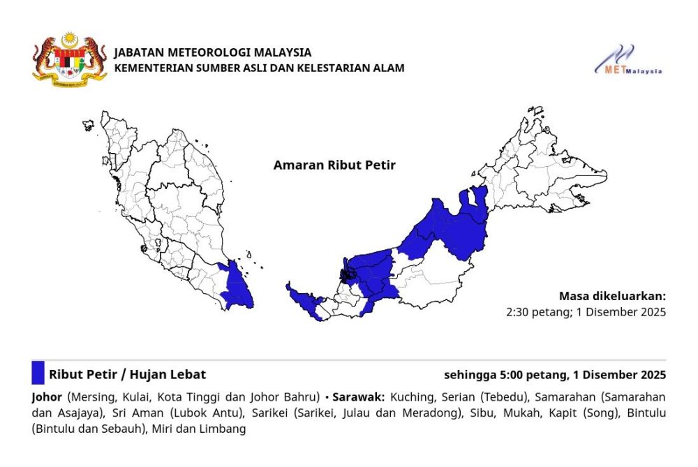 马来西亚气象局(MetMalaysia)于今日下午2时30分发布最新的“雷暴警报”(AMARAN RIBUT PETIR),预测柔佛州东部和南部,以及砂拉越州多处将出现雷暴、大雨及强风。警报有效期将持续至今日傍晚5时正