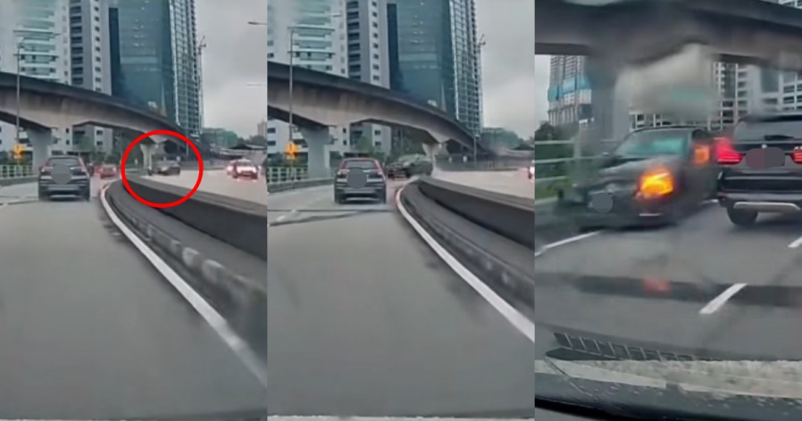 八打灵再也孟沙高架天桥近日发生惊险意外,一辆马赛地轿车疑因失控冲入反向车道,与对向驶来的宝马仅差毫厘擦身而过,随后再猛烈撞上高架护栏,只差一步便可能从桥面冲出坠下。