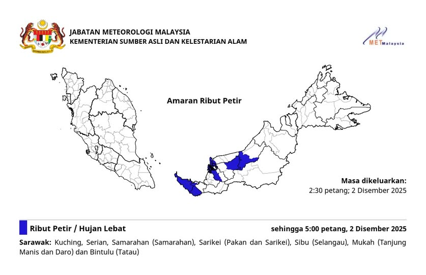 砂拉越多个地区预计将出现雷暴、暴雨与强风天气,受影响区域包括:古晋、实兰沟、三马拉汉(Samarahan)、诗巫(Selangau)、泗里街(Pakan 与 Sarikei)、木胶(Tanjung Manis 与 Daro)以及民都鲁(Tatau)。预警有效至 2025 年 12 月 2 日星期二下午 5 时。