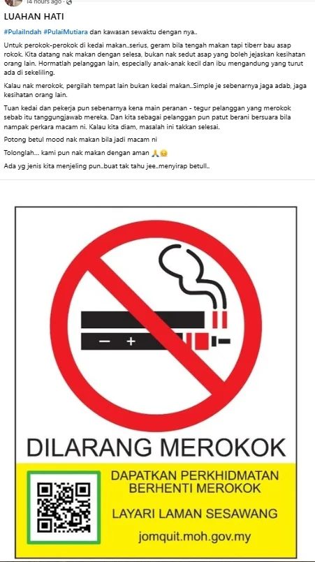 在帖文中,这位女网友也分享了相关的法律信息,指出在禁烟场所吸烟的烟民最高可被罚款5000令吉,而若餐馆老板未能制止吸烟行为,也会面临同样的罚款。她呼吁大家一同举报在餐馆内吸烟的烟民,举报可通过WhatsApp热线+6010-8608949、热线03-88924530,或者通过官网https://jomlapor.com/report-form提交,举报时需附上照片或视频、事件和准确地点等相关信息。