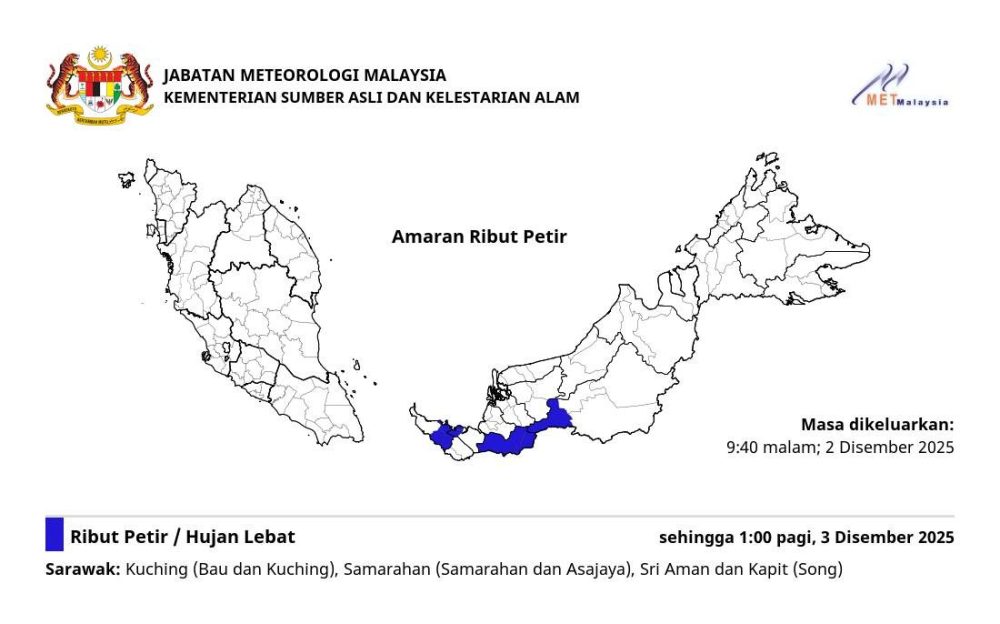 马来西亚气象局(MetMalaysia)于今日晚间9时40分发布最新的**“雷暴警报”(AMARAN RIBUT PETIR),预测东马砂拉越和沙巴的多州将出现雷暴、大雨及强风**。警报有效期将持续至明天(12月3日)凌晨3时正。