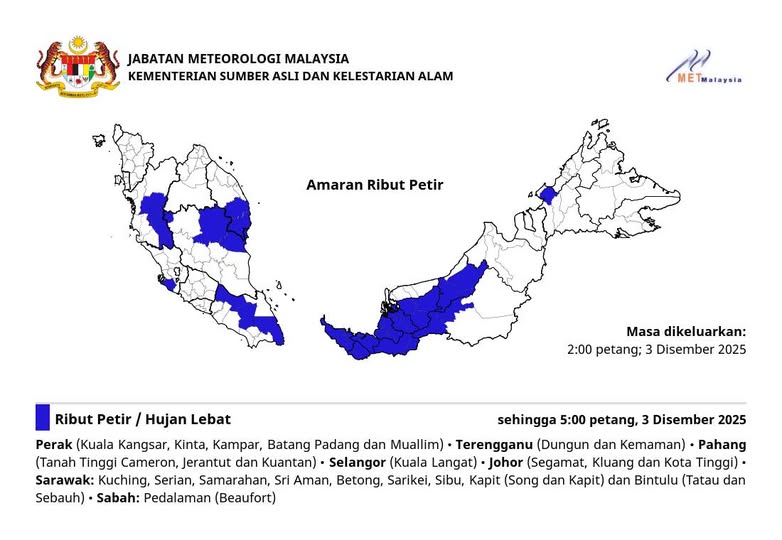 大马气象局(MET Malaysia)今日下午2时发布雷暴与豪雨预警,多个州属预计将持续出现强降雨与雷暴天气,预警有效至今日(12月3日)傍晚5时。