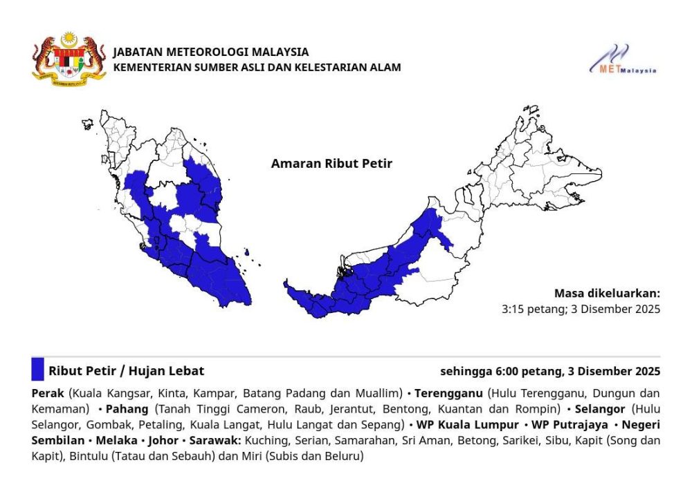 马来西亚气象局(MetMalaysia)于今日下午3时15分发布最新的“雷暴警报”(AMARAN RIBUT PETIR),预测半岛几乎全境以及东马砂拉越多州将出现雷暴、大雨及强风。警报范围极广,有效期将持续至今日傍晚6时正。