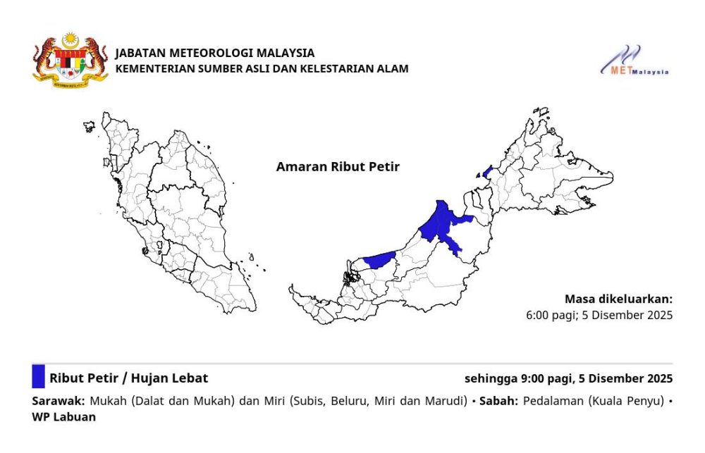 大马气象局(METMalaysia)今早6时发布雷暴与豪雨预警,部分砂拉越、沙巴及纳闽地区预计将出现强降雨与雷暴天气,警报有效至今日(12月5日)早上9时。