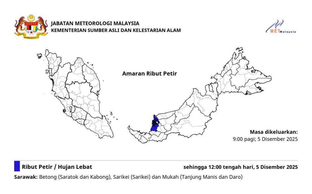 马来西亚气象局(MetMalaysia/Jabatan Meteorologi Malaysia)针对砂拉越特定地区发出的雷暴和强降雨恶劣天气警告。此警告是在预计降雨强度将超过每小时 20 毫米并持续超过一小时时发出。