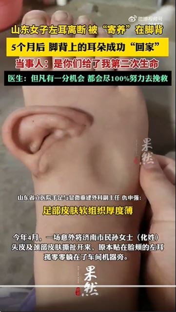 中国济南一名孙姓女子(化名)在4月发生严重意外,左耳整只被撕裂离断。为了保住她的耳朵并尽可能恢复容貌,医生采取罕见方式——将离断的耳朵“寄养”在她的脚背上。经过5个月的精心照护,这只被寄养的耳朵终于成功“回归原位”,重返脸庞。