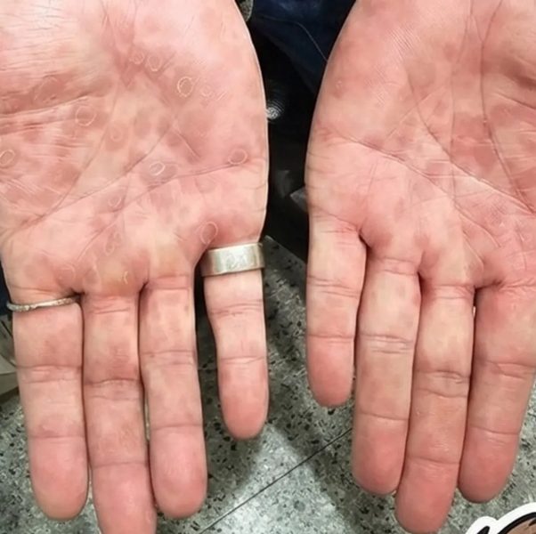 医师指出,梅毒被称为医学界的「伟大的模仿者(The Great Imitator)」,因为其症状千变万化,常伪装成各种皮肤病。这名男子出现的“手掌红斑”,正是二期梅毒的典型特征:
