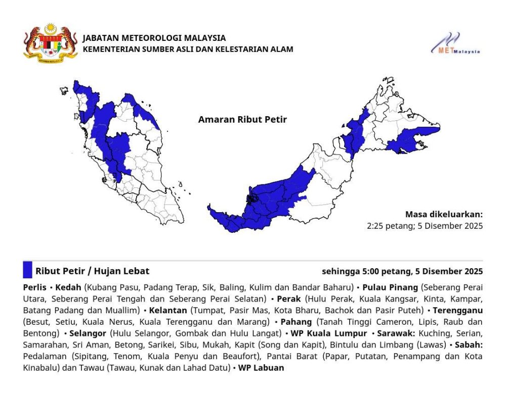 马来西亚气象局发布短期天气预警:玻璃市、吉打、槟城、霹雳、吉兰丹、登嘉楼、彭亨、雪兰莪、吉隆坡、砂拉越及沙巴多个县区预计将出现雷暴和强降雨,警报有效期持续至2025年12月5日(周五)下午5时正