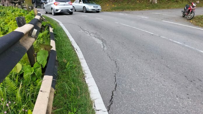 连日来,加帛地区雨水不断,使得诗里烈路山坡路段面临严重的山体滑坡风险!尤其靠近加帛国民中学(SMK Kapit)附近的斜坡路段,已出现轻微裂痕