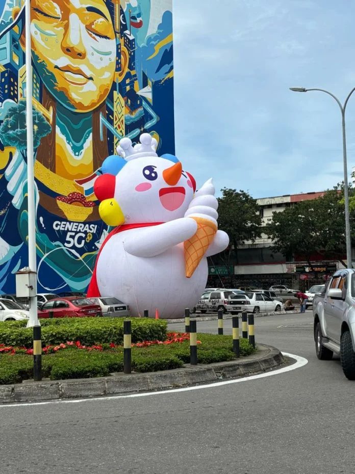 亚庇市中心海旁街近日迎来一位超吸睛的“不速之客”!一座巨大的白色充气卡通娃娃赫然坐落在泊车位上,以其超高的身形成为路过民众驻足观望、拍照打卡的最新靓丽风景线。