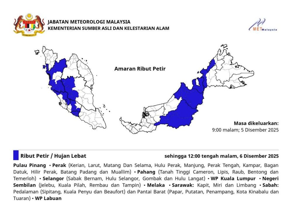马来西亚气象局发布短期天气预警:槟城、霹雳、彭亨、雪兰莪、吉隆坡、森美兰、马六甲、砂拉越、沙巴及纳闽多个县区预计将出现雷暴和强降雨,警报有效期持续至2025年12月6日(周六)午夜12时正