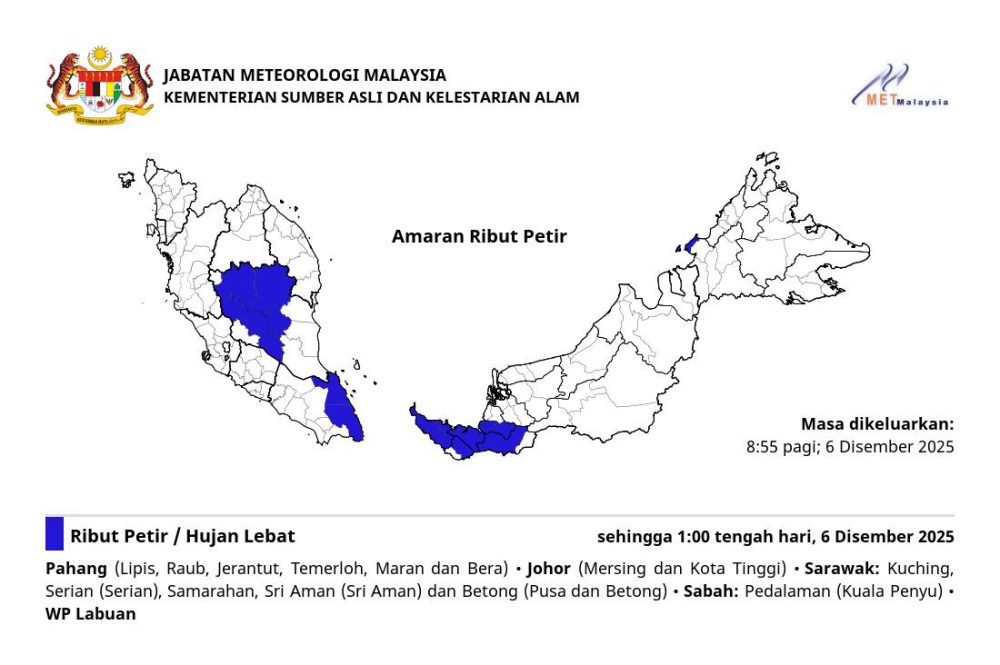 大马气象局今早发布雷暴预警,指多州将出现雷暴、豪雨及强风天气,预料将持续至今日(12月6日,星期六)中午1时。
