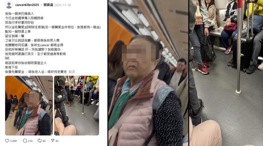 香港地铁“关爱座”再度引发争议。一名患癌男子近日在社交平台Threads发文,控诉自己在港铁坐上关爱座休息时,被一名老妇出言羞辱,令他大感委屈。