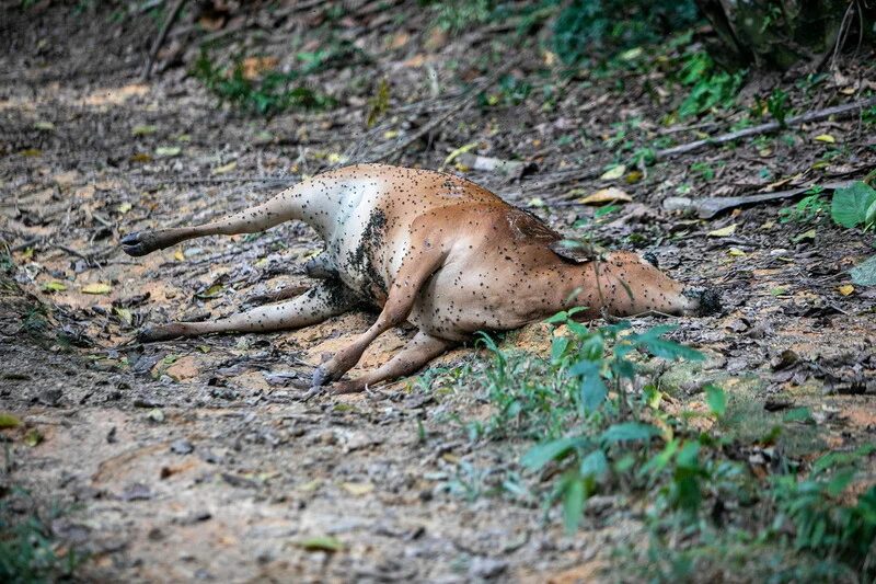 马新社记者随警方及大马半岛野生动物保护及国家公园局人员到场时,发现新鲜的老虎足迹。工作人员还检查了陷阱摄像机和死牛遗骸,试图追踪老虎是否将牛拖走。