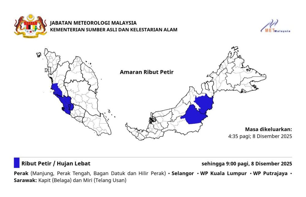 大马气象局发布雷暴预警。霹雳州(曼绒、近打中部、峇眼拿督、下霹雳)、雪兰莪、吉隆坡、布城,以及砂拉越卡比特省(Belaga)与美里省(Telang Usan),预计将出现雷暴、豪雨与强风,预料持续至 今日(12月8日,星期一)早上9时