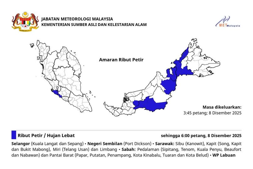马来西亚气象局发布雷暴雨警告。预计以下地区将出现雷暴、大雨和强风,持续至今日(2025年12月8日)傍晚6时: