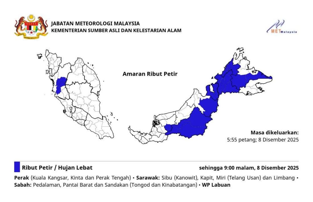 马来西亚气象局(MetMalaysia)于2025年12月8日傍晚5时55分发布最新的“雷暴警报”(AMARAN RIBUT PETIR),预测半岛霹雳州中部以及东马砂拉越、沙巴的大片地区和纳闽将出现雷暴、大雨及强风。警报有效期将持续至今日晚间9时正。
