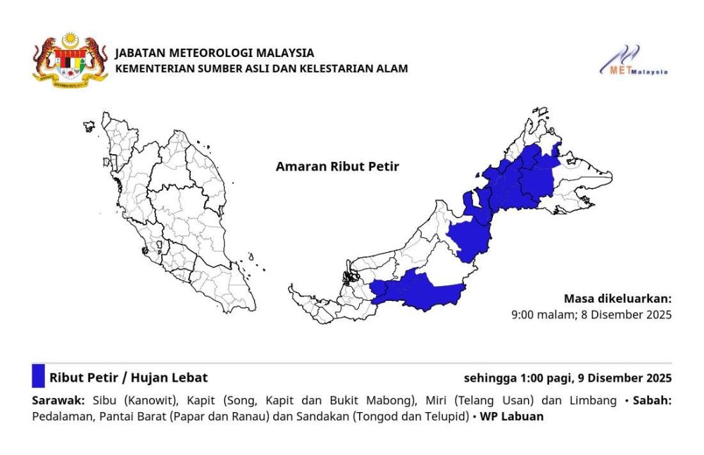马来西亚气象局(MetMalaysia)于今日晚间9时正发布最新的“雷暴警报”(AMARAN RIBUT PETIR),预测东马砂拉越、沙巴的部分地区以及纳闽将出现雷暴、大雨及强风。警报主要集中在砂拉越中北部、沙巴内陆和西海岸,有效期将持续至明日(9日)凌晨1时正。