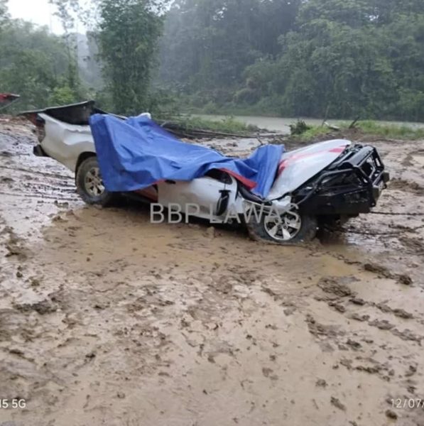 甘榜伯鲁弯发生一起惨烈致命事故!一台巨大的打桩机(drilling rig)突然倒塌,直接压中一辆四轮驱动车,导致车内一名31岁的男子当场死亡。
