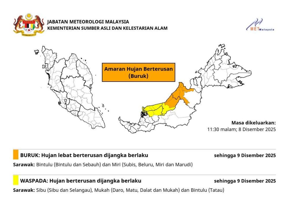 马来西亚气象局(MetMalaysia)于12月8日晚11时30分发布最新持续降雨警报,针对砂拉越的中部和北部沿海地区,发布了最高级别的红色警报(BURUK,恶劣),以及次一级的黄色警报(WASPADA,警惕)。