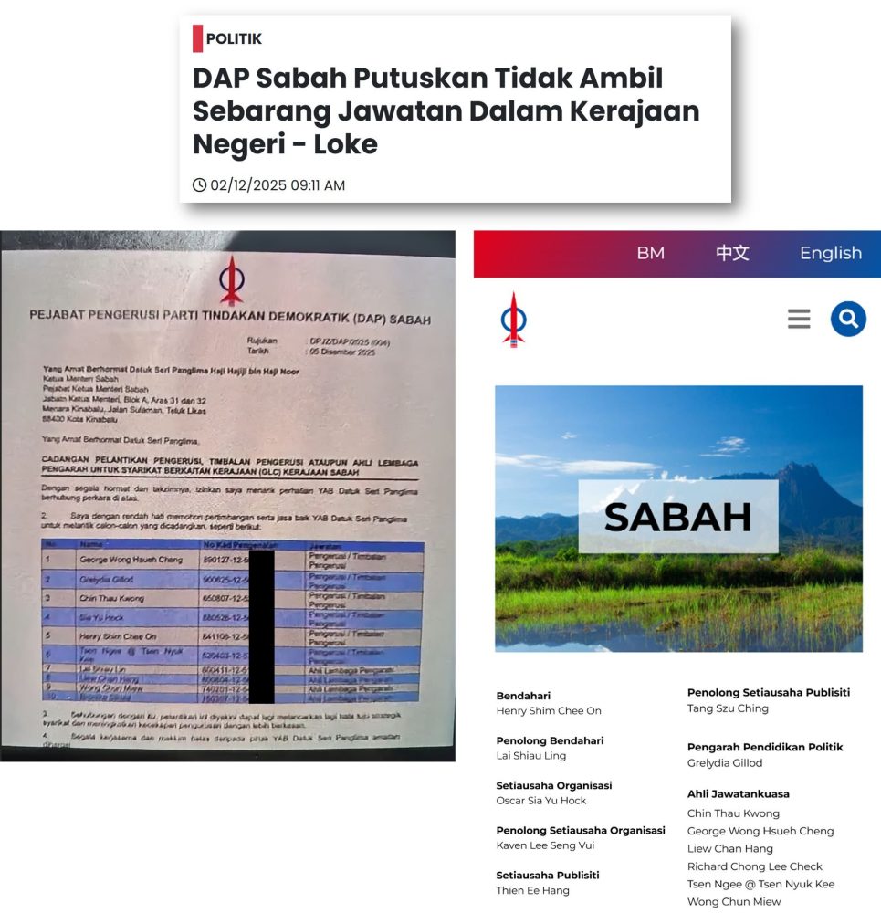 他还指出,这封信函与陆兆福于12月2日公开的声明相矛盾。陆兆福曾表示,行动党在2025年沙巴人民代表大会后不会再在沙巴政府中担任任何职务,因此信中提到的要求获得沙巴政府职务的建议显得尤为不合理。