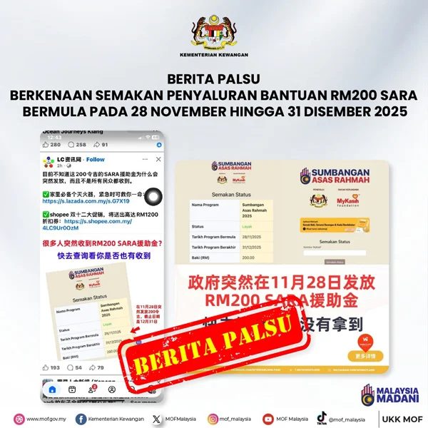 财政部今日发文澄清,近期在社交媒体疯传的“政府派发200令吉关爱基本援助金(SARA)”消息纯属假讯息,提醒民众切勿点击相关连结,以免落入诈骗陷阱。