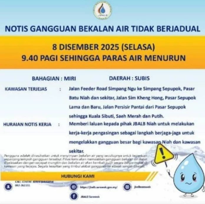 美里苏必士区部分地区发出临时供水中断通知。由于水位上涨,尼亚水务局(JBALB Niah)宣布,从12月8日(星期二)上午9时40分起,受影响区域将出现不定期供水中断。